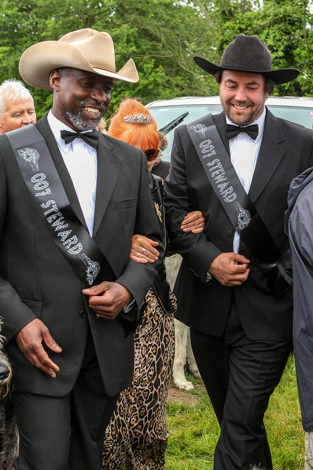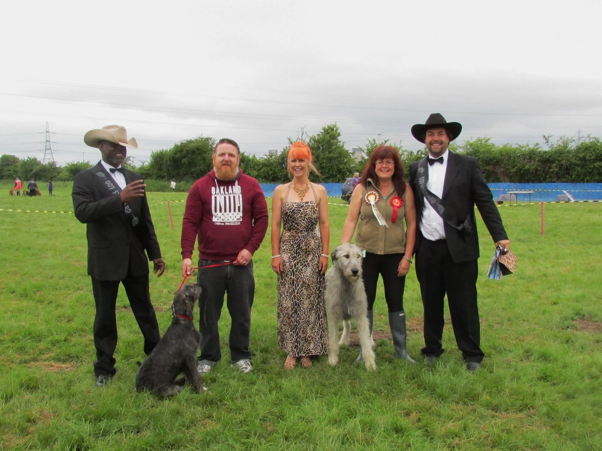 Like all other such events, a large amount of hard work and organisation went into the show and the Wolfhound classes in particular and the afternoon was aimed at providing all the attendees with a real different ‘show’ experience and an outrageously good time. The James Bond theme for the classes was kicked off by the very glamorous judge, Caroline Sheppard (Goldswift) being escorted into the ring by her pair of 007 stewards, dressed in tuxedo’s and sporting sashes of Carl ‘the Cube’ Brown and Hugh ‘the Hair’ Broadbent, obviously to the classic theme tune of James Bond playing loudly in the background. This set the tone for the rest of the day and was greatly appreciated by all attending the show.