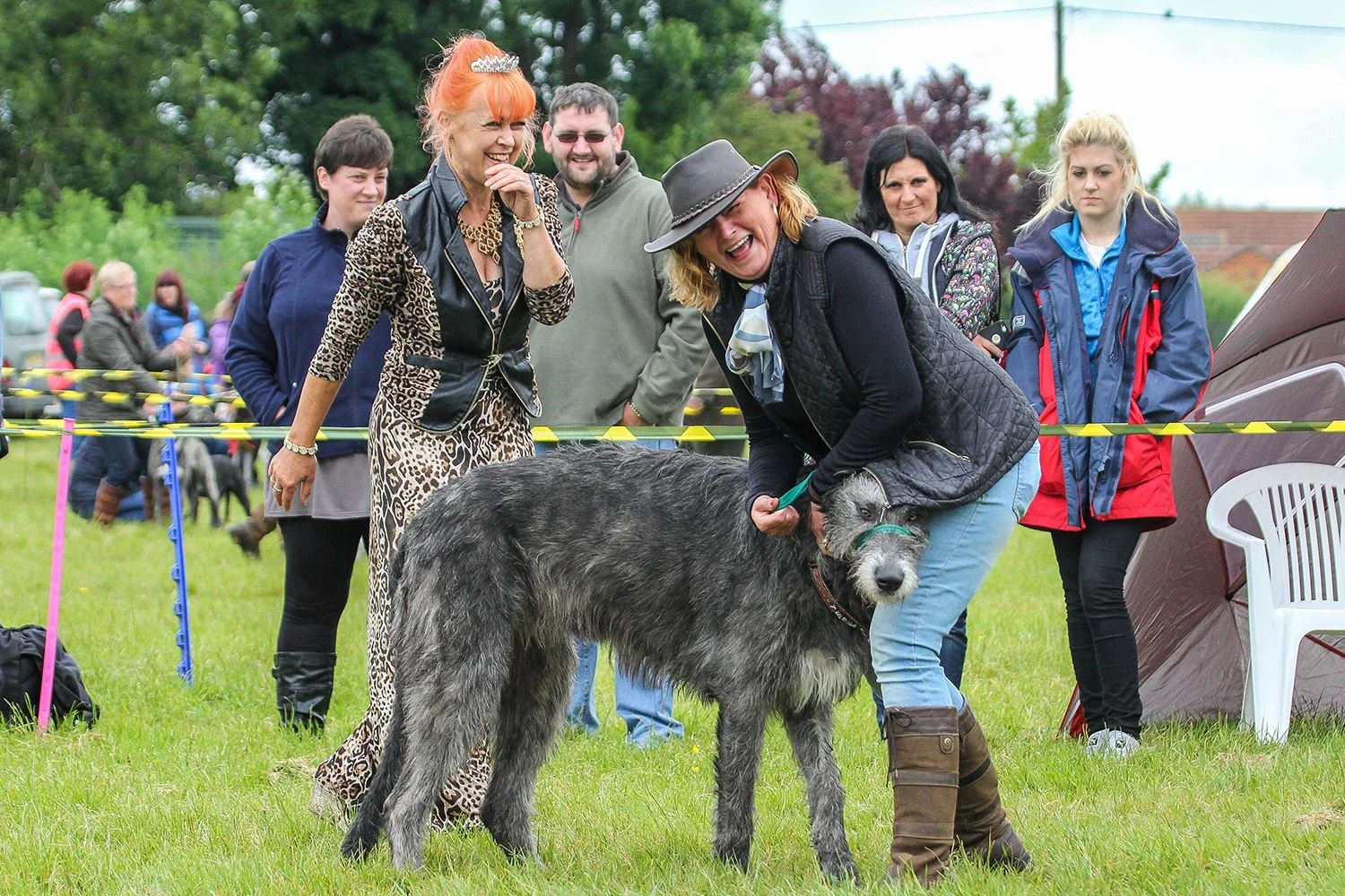 James Bond teamed with a very glamorous Bond girl and glasses of bubbly is a familiar concept to most people, but it is not often you picture them on a damp overcast afternoon, in a field in rural Lincolnshire with 30 Wolfhounds, raising money for research into osteosarcoma. On Sunday 14th June 2015 this unique combination did indeed come together with sensational results and not even the inclement weather could dampen the spirits of the participants. The Long Nose Day fun show is now in its 10th year and is a 2 day companion show organised by the Lincolnshire Greyhound Trust with the Saturday reserved for Greyhound only classes and the Sunday opened up to other breeds and novelty classes, plus various other canine activities such as giant dog agility, pet gundog scurry and speed jumping.